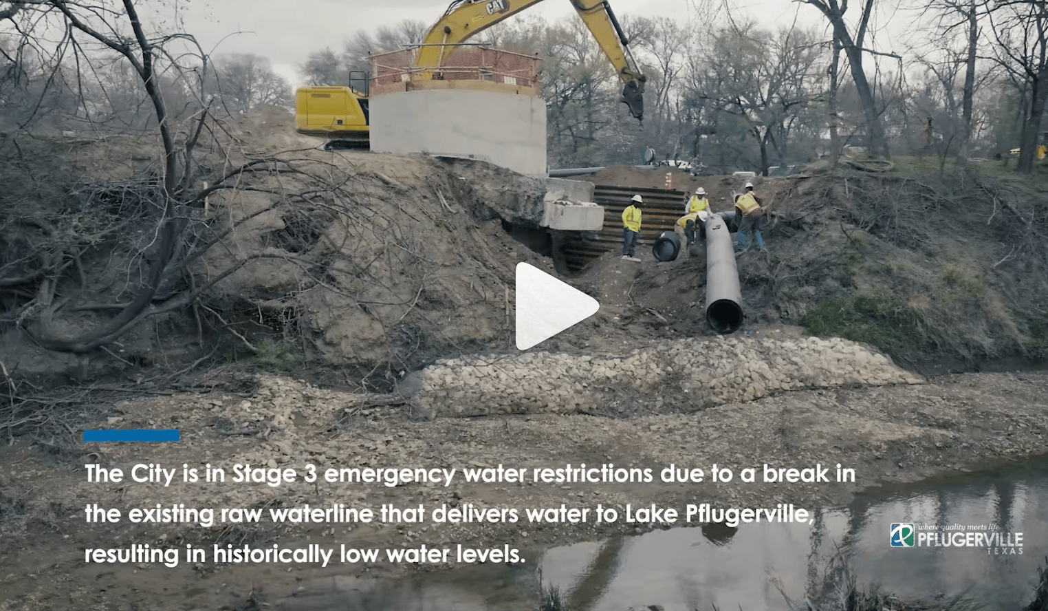 The water line that feeds Lake Pflugerville, our source for water, was ruptured last week. The good news is that a temporary bypass line is [knock on wood] still on schedule to be completed today, 3/10. That doesn’t mean an immediate easing of water restrictions, however.