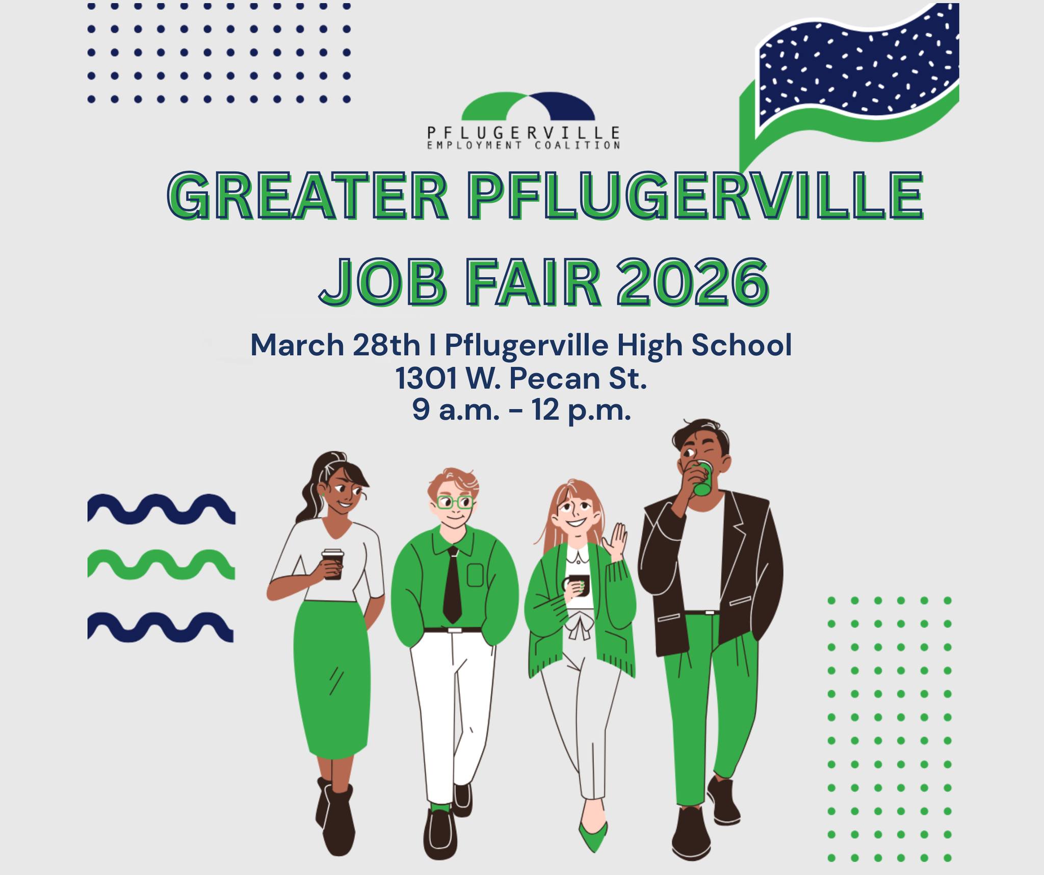 Pflugerville Job Fair @ PHS Gym — Sat, Mar 28 · 9:00 AM–Noon · 1301 W Pecan St · Free, no registration 50+ employers on site — PFISD, Pflugerville Fire, and a bunch of local businesses — all actively hiring. Free professional headshots available. Bring extra résumés.
